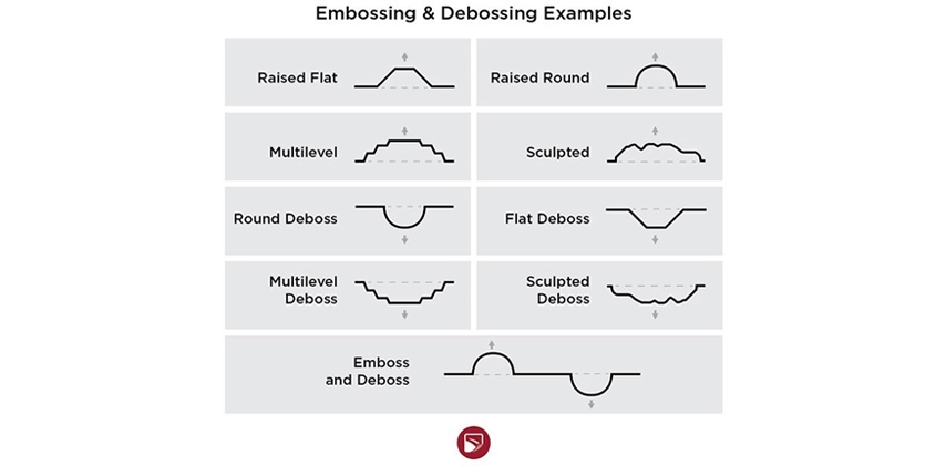 There are several specific standard types of embossing and debossing and it can be helpful to know the terminology for the different styles. The various profiles shown here are based on the type of tooling used to create the effect: